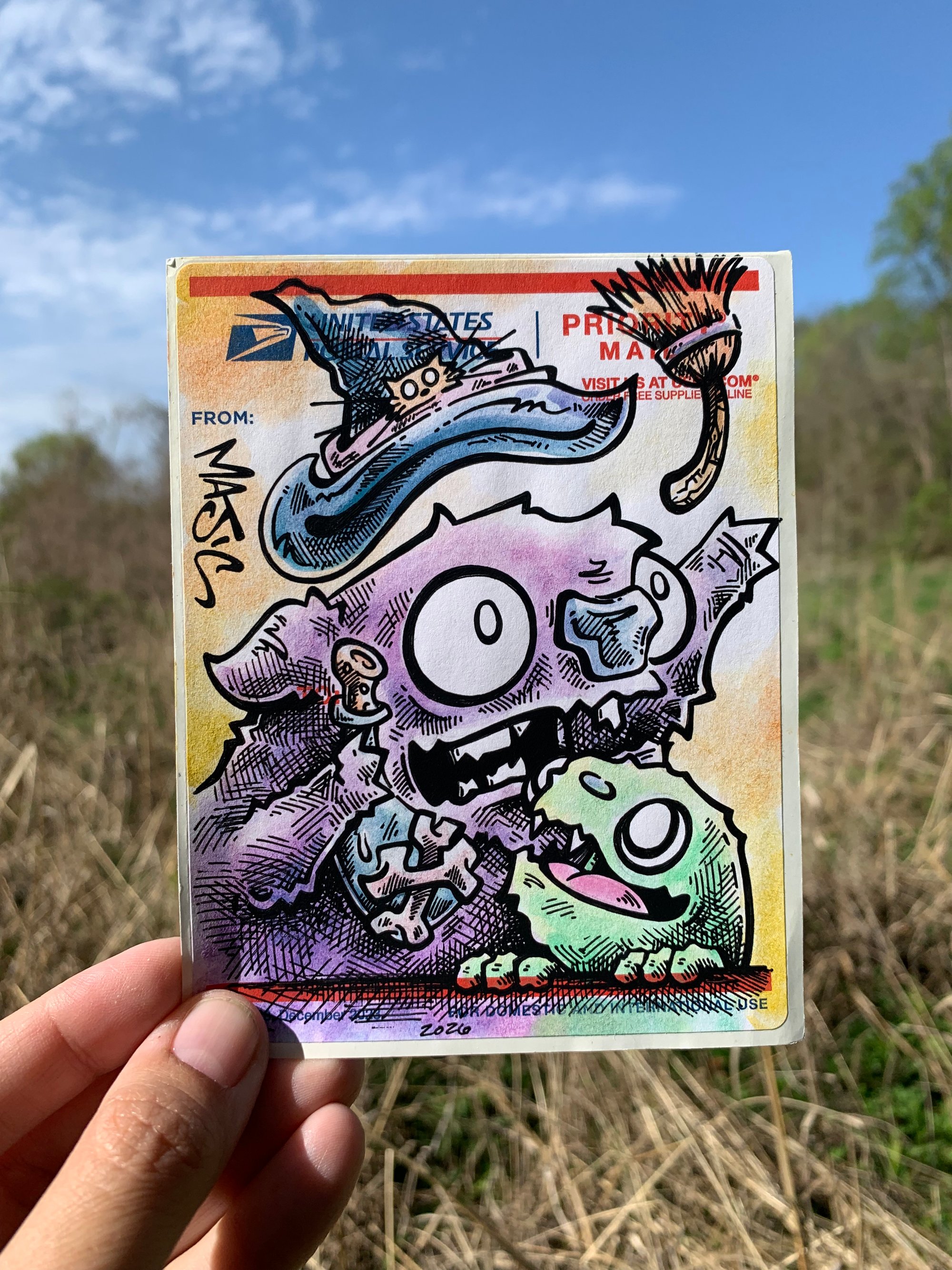 Original art on a Label 228 sticker. The background is watercolor and the lines are ink. Measures 4.25”x5.5”.
