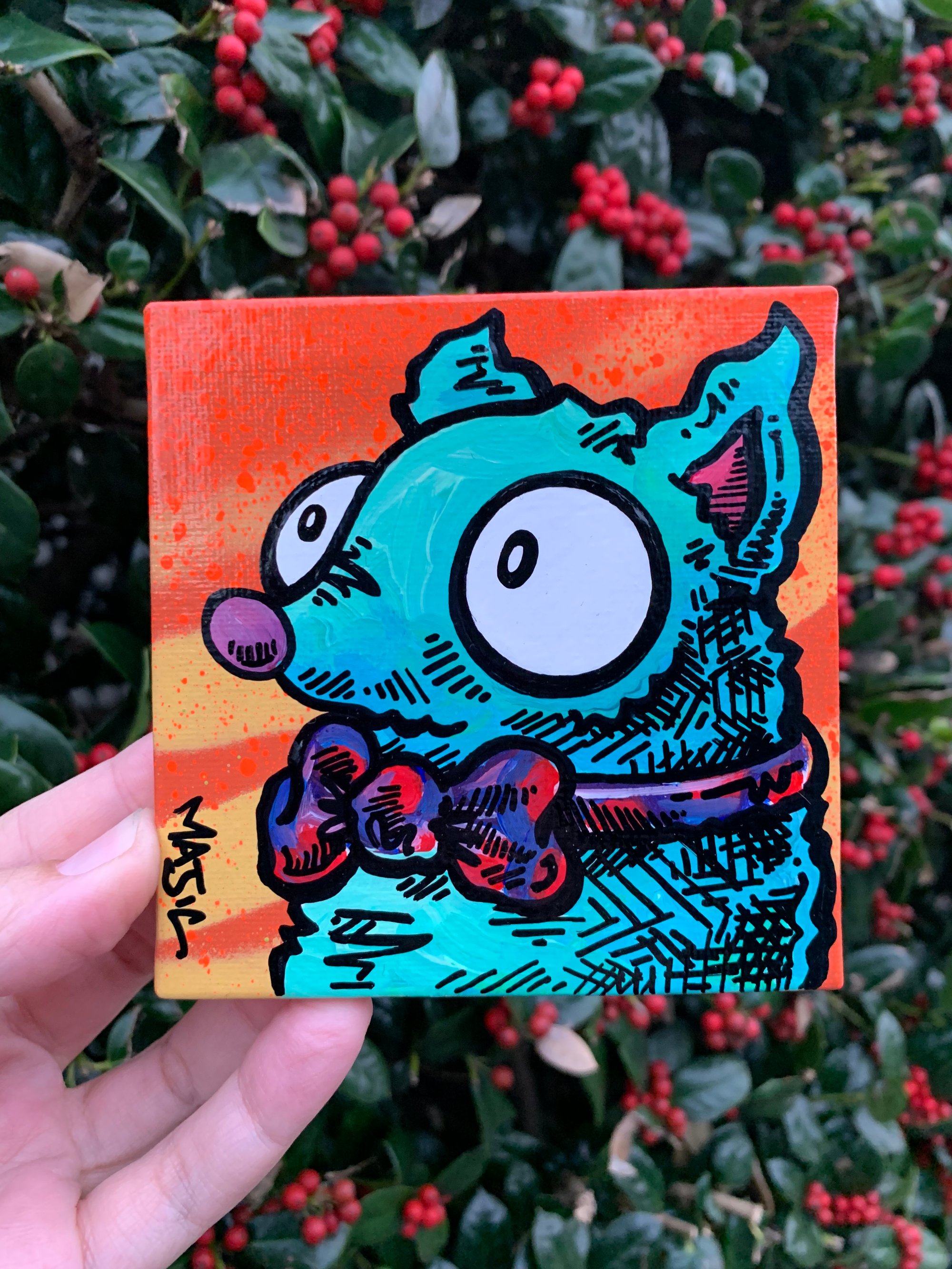 This piece is an original acrylic painting on canvas with paint marker outlines. Measures 4”x4”x 3/8”.