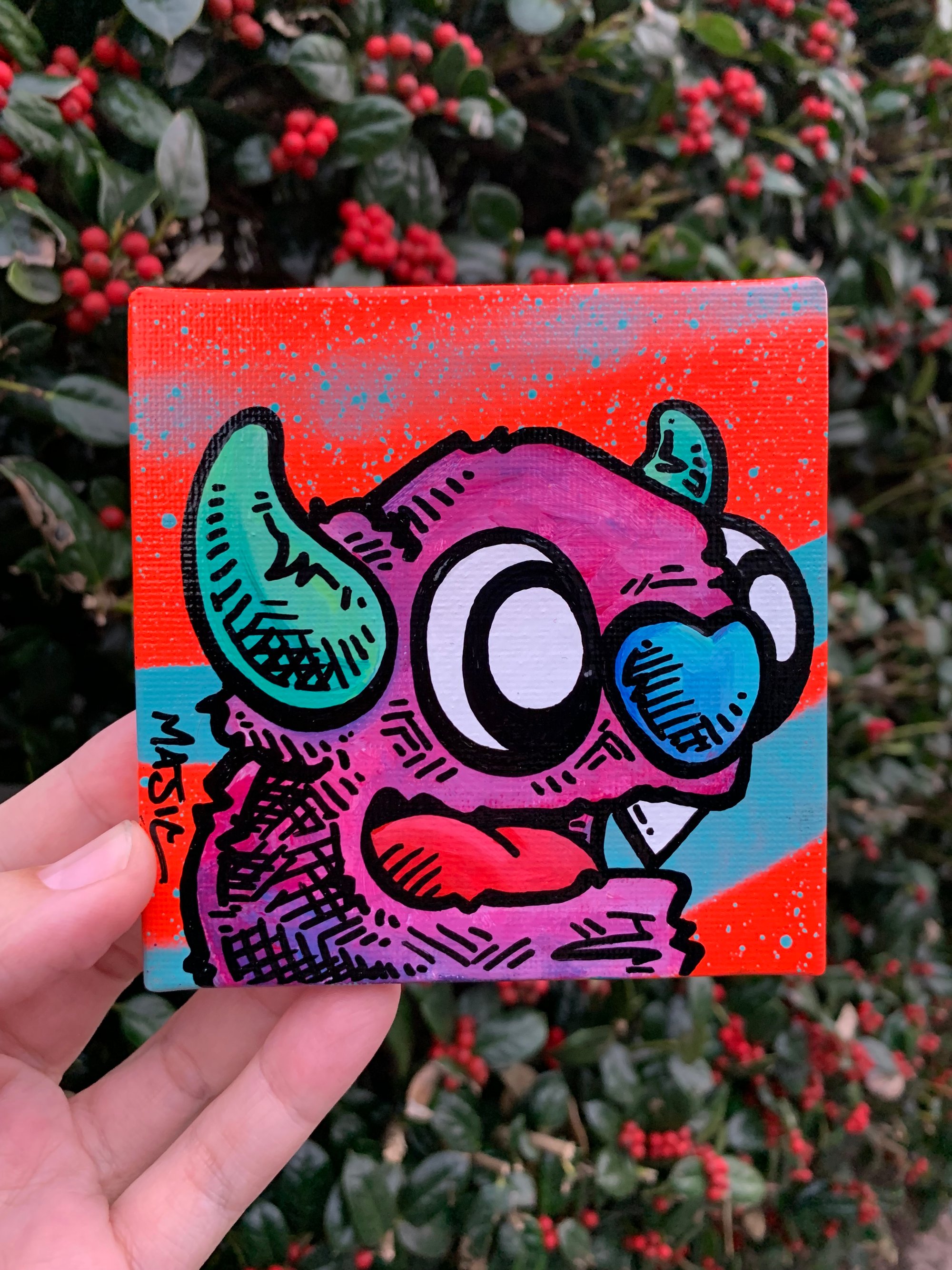 This piece is an original acrylic painting on canvas with paint marker outlines. Measures 4”x4”x 3/8”.