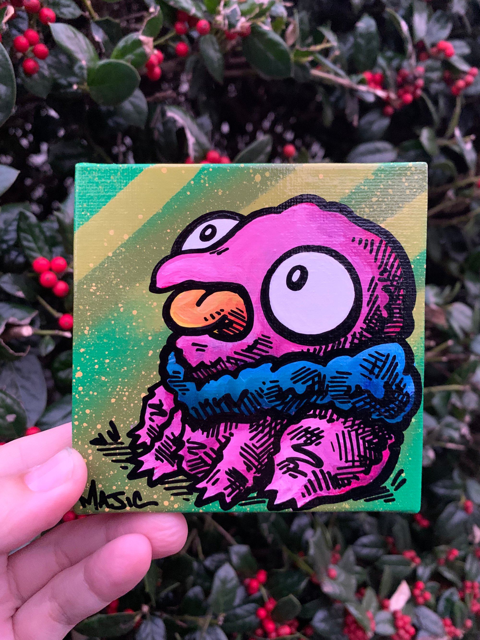 This piece is an original acrylic painting on canvas with paint marker outlines. Measures 4”x4”x 3/8”.